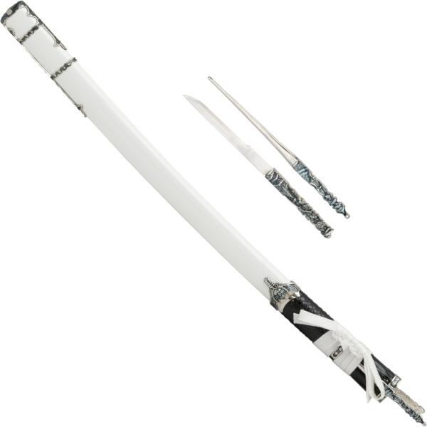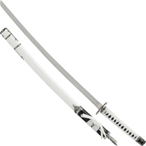 Die Scheide ist mit Beschlägen und Fischhautimitat reich verziert. An der Tsuba sind zwei Beimesser, Kozuga und Kogai eingesteckt. Die Klinge aus Kohlenstoffstahl ist nicht rostfrei.