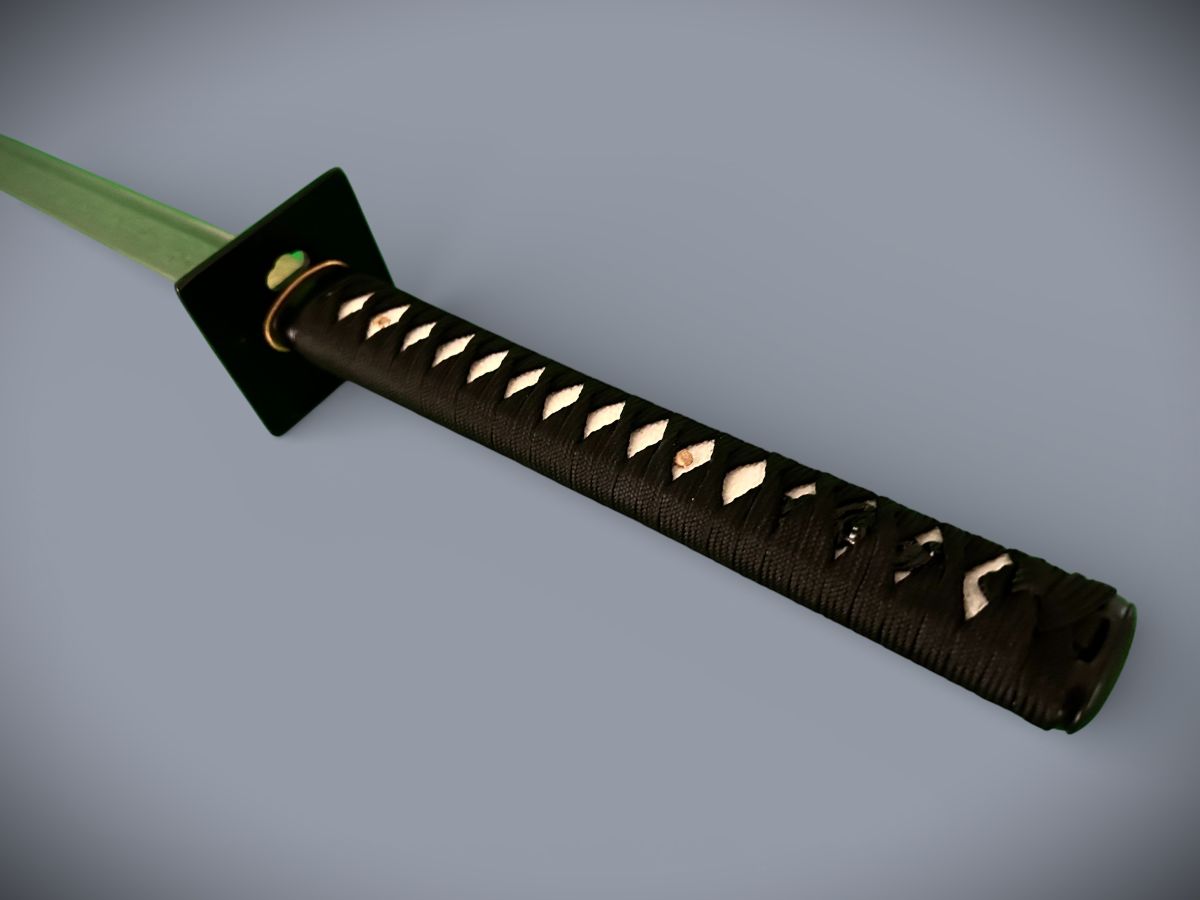 Die Griffwicklung (Tsuka-Ito) ist aus schwarzer Baumwolle traditionell angebracht.