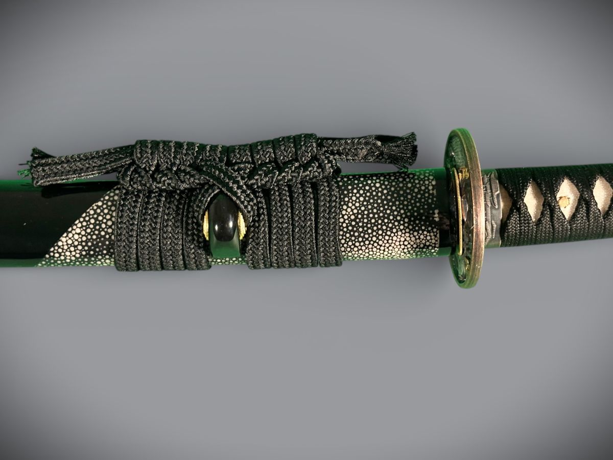 - Der Griff (Tsuka) ist aus Holz, mit echter Rochenhaut (Same) belegt
