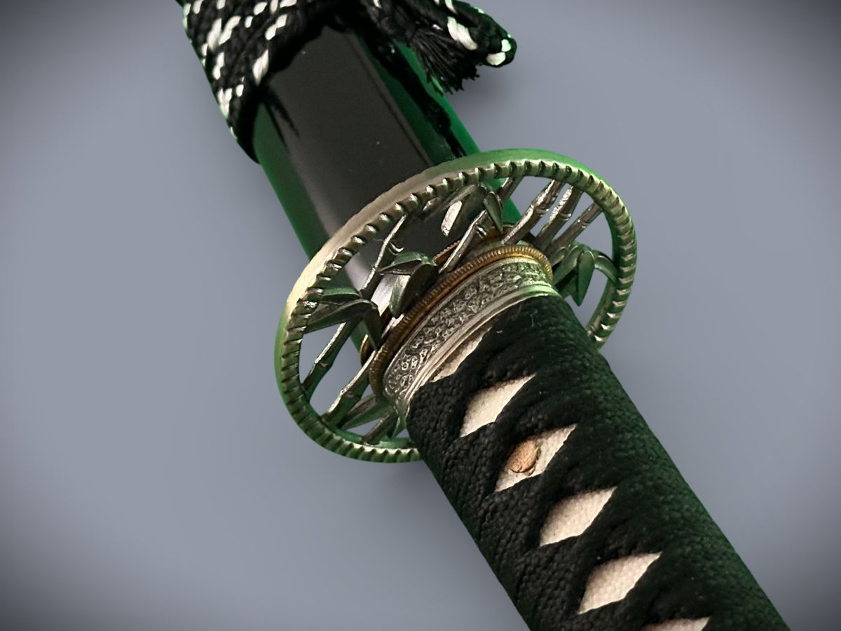 Die Griffwicklung (Tsuka-Ito) ist aus Seide traditionell angebracht.